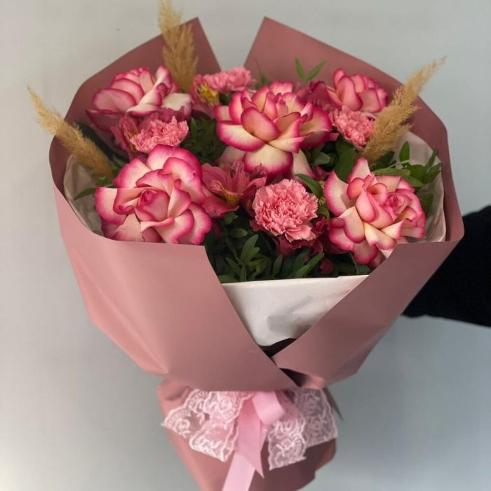 Альстромерии, Гвоздики, Кустовые розы, Лизиантусы, Розы, Хризантемы