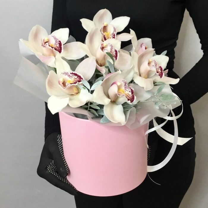 Лента атласная – 1 шт.Оазис флористический – 1 шт.Цимбидиум белый – 7 шт.фисташка крашенная – 3 шт.коробка шляпная 16х16 – 1 шт.