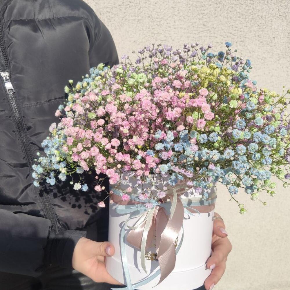 Букет из цветов и макаронс в декоративной коробке "Капельки росы"