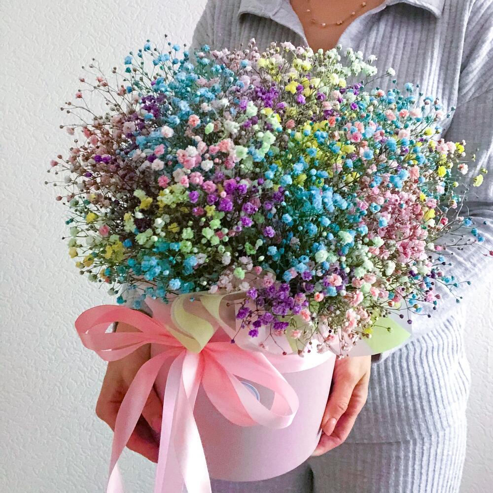 Шляпная коробка – 1 шт.гипсофила цветная – 8 шт.Лента атласная – 2 шт.Тишью – 4 шт.Губка флористическая – 3 шт.Упаковка транспортировочная пленка – 1 шт.