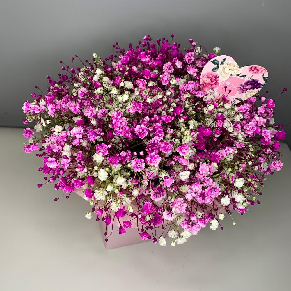 гипсофила цветная – 5 шт.Коробка – 1 шт.Тишью – 3 шт.Топпер – 1 шт.Пленка прозрачная – 1 шт.Лента атласная – 2 шт.