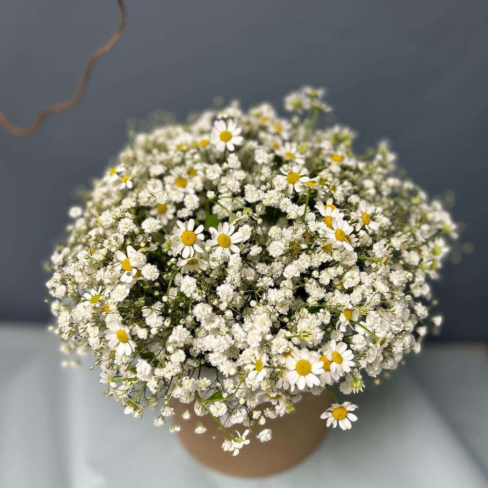 Коробка с гипсофилой и ромашкой