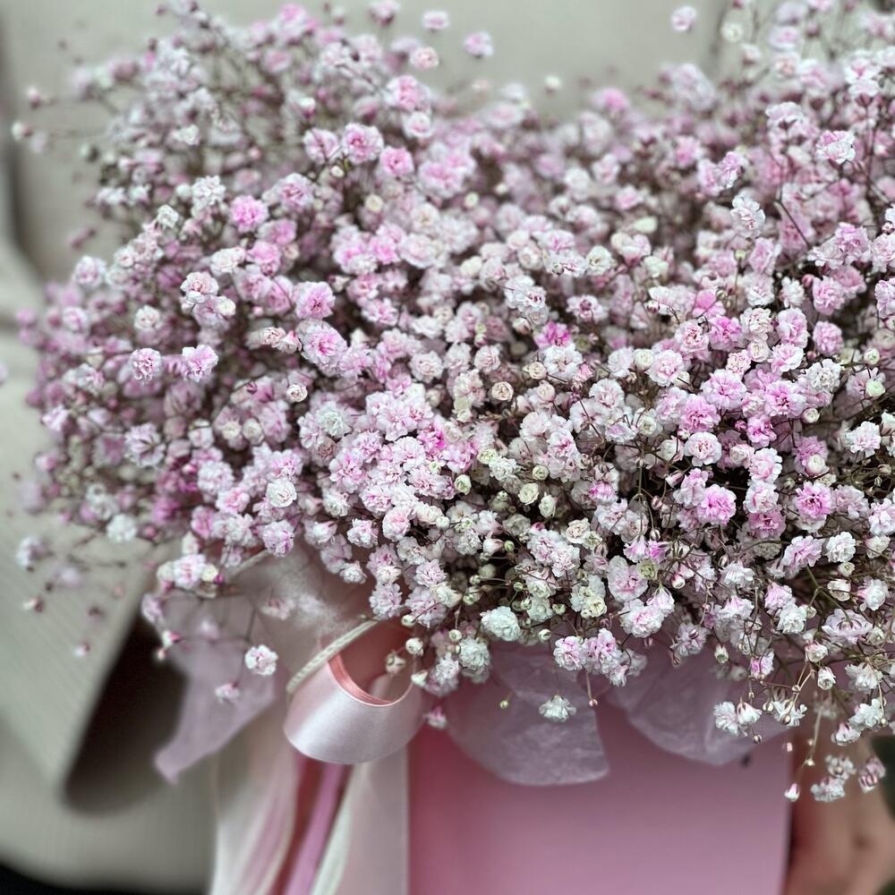 “Сиреневый туман” – композиция из гипсофилы в шляпной коробке