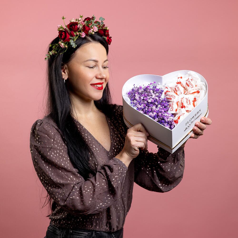 Бумага тишью – 2 шт.конфеты раффаэлло – 15 шт.кирпич oasis классик – 1 шт.гипсофила розовый – 2 шт.коробка сердце белый – 1 шт.