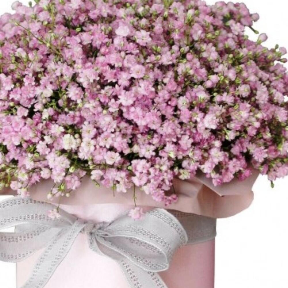 Розовая гипсофила в шляпной коробке