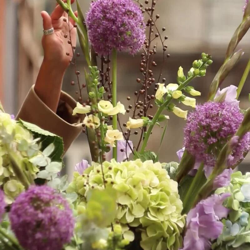 Гортензия – 5 шт.Аллиум – 5 шт.Гладиолус – 7 шт.Наперстянка – 5 шт.Лен – 3 шт.Эвкалипт – 9 шт.Лента – 1 шт.