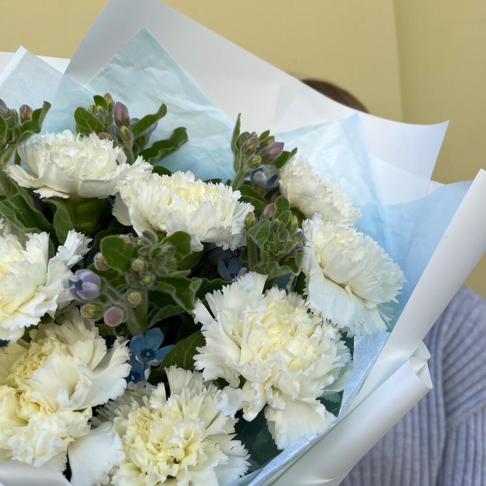 Лента атласная – 2 шт.Упаковка корейская пленка – 1 шт.тишью голубое – 1 шт.твидия голубая – 5 шт.диантус белоснежный – 9 шт.