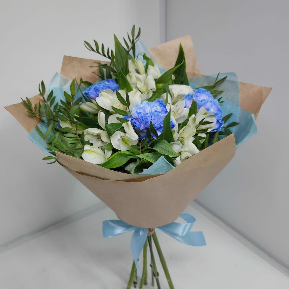 Альстромерия – 4 шт.Дизайнерская упаковка – 1 шт.зелень фисташки – 1 шт.диантусы голубые – 3 шт.