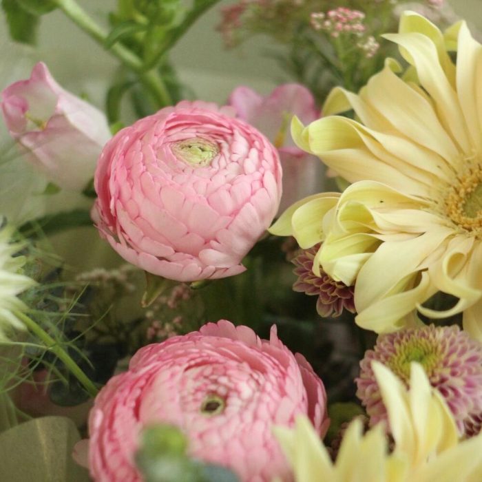 гербера кудрявая – 2 шт.Ранункулюс – 2 шт.Колокольчик – 1 шт.Маттиола – 1 шт.Львиный зев – 1 шт.Озотамнус – 1 шт.тмин – 2 шт.Диантус – 2 шт.Эвкалипт – 3 шт.Упаковка – 1 шт.