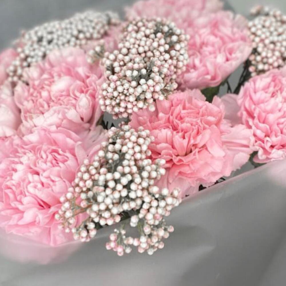 Нежные диантусы в сочетание с экзотическим растением «озотамнум» в легкой воздушной упаковкеОткрытка с вашим текстом в подарок