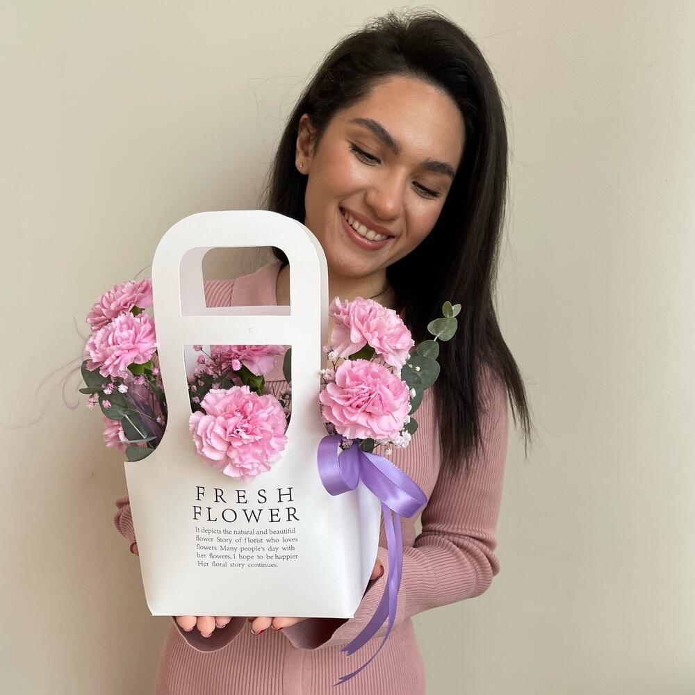 Эвкалипт – 1 шт.Лента атласная – 1 шт.Диантус – 9 шт.Ковыль – 1 шт.Оазис флористический – 1 шт.Пакет для цветов – 1 шт.