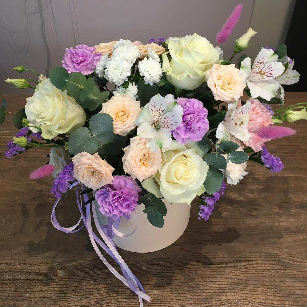 Нежная композиция из роз, кустовых роз, альстромерии и гвоздики с добавлением зелени и сухоцветов в шляпной коробке