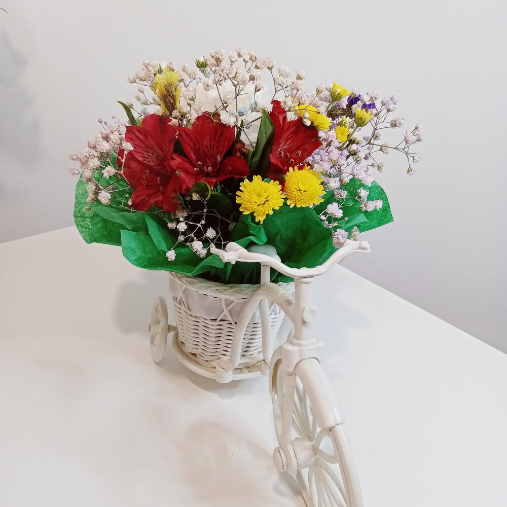 Диантус – 1 шт.альстромерия микс – 2 шт.гипсофила микс – 1 шт.Хризантема кустовая Сантини – 1 шт.Статица – 1 шт.Флористический оазис – 1 шт.Велосипед – 1 шт.