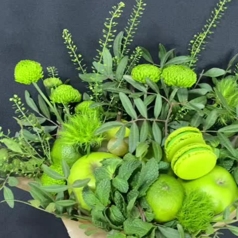 яблоки зеленые – 3 шт.груши – 2 шт.Виноград – 1 шт.Пирожные макарон – 3 шт.Лайм – 1 шт.хризантема кустовая или альстромерия или гвоздика – 3 шт.зелень фисташки – 3 шт.Мята – 2 шт.