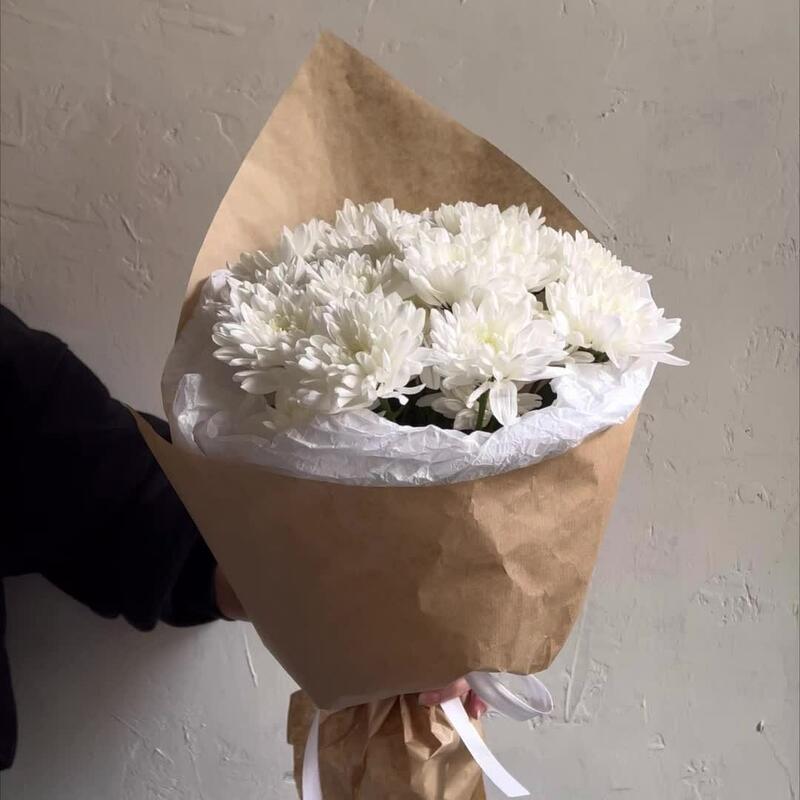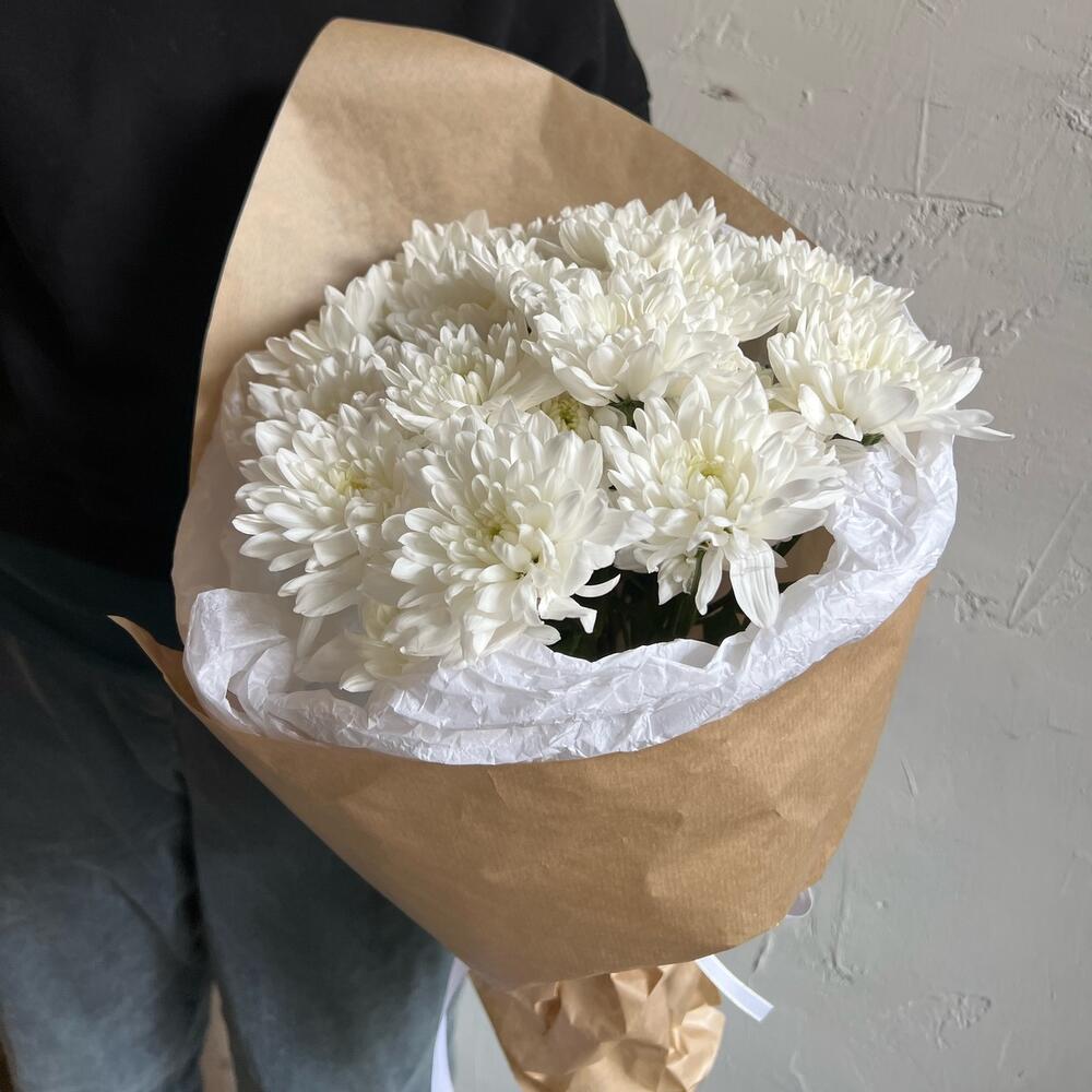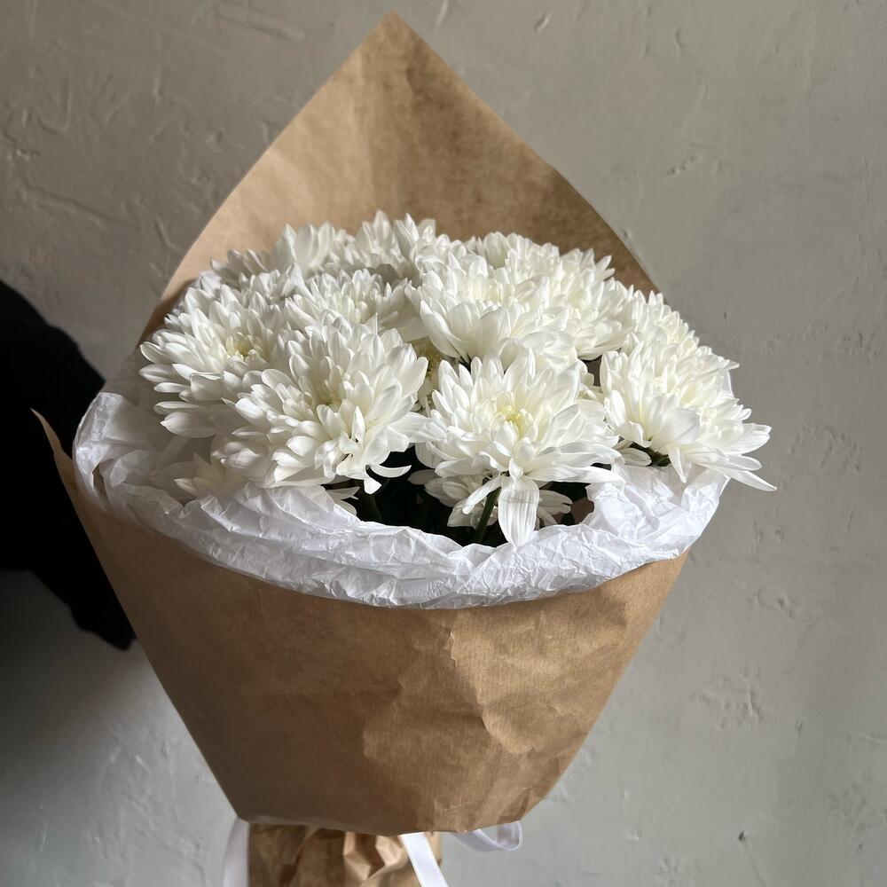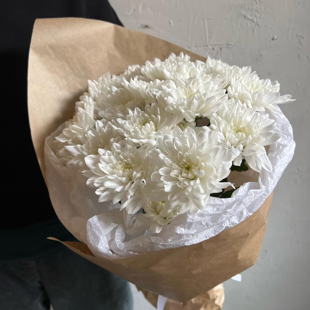 Хризантема кустовая – 5 шт.Лента атласная – 2 шт.Упаковка дизайнерская – 2 шт.
