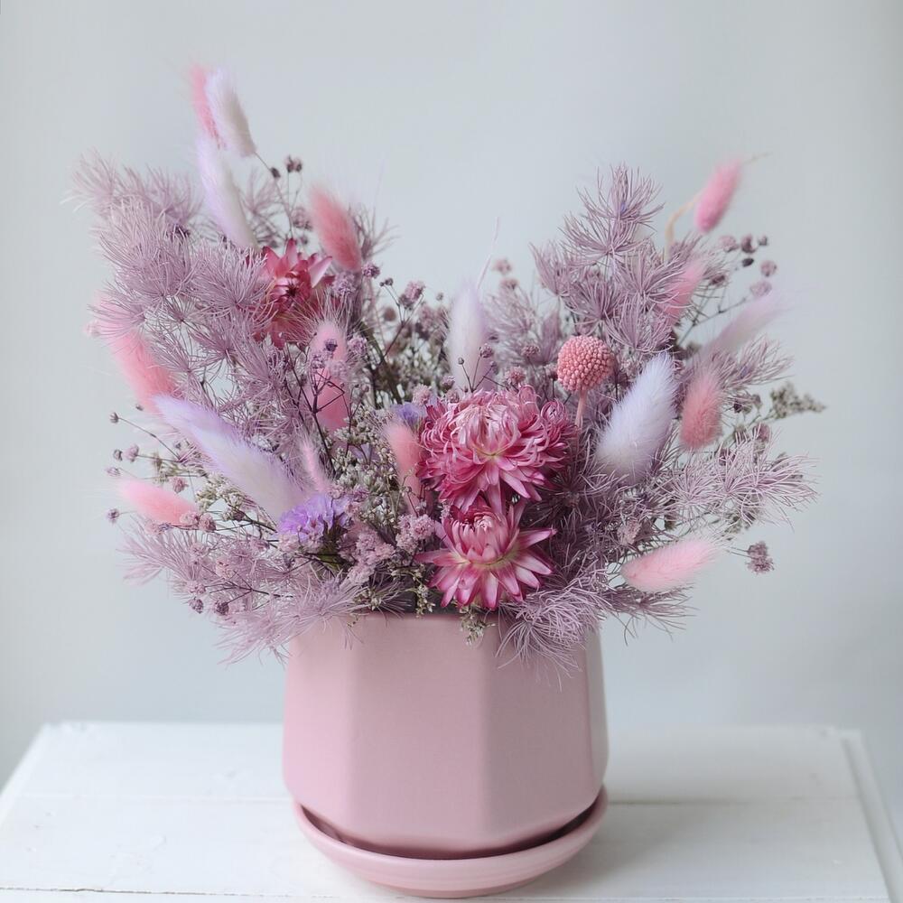 Интерьерная композиция из сухоцветов в розово-сиреневых тонах