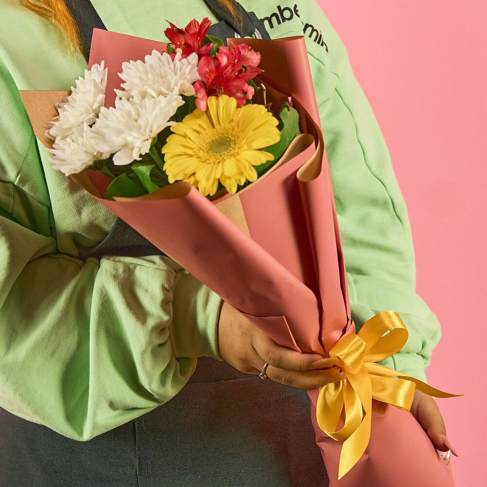 Лента атласная – 1 шт.хризантема кустовая (белый) – 1 шт.пленка цветная – 1 шт.гербера (желтый) – 1 шт.альстромерия ( красный) – 1 шт.