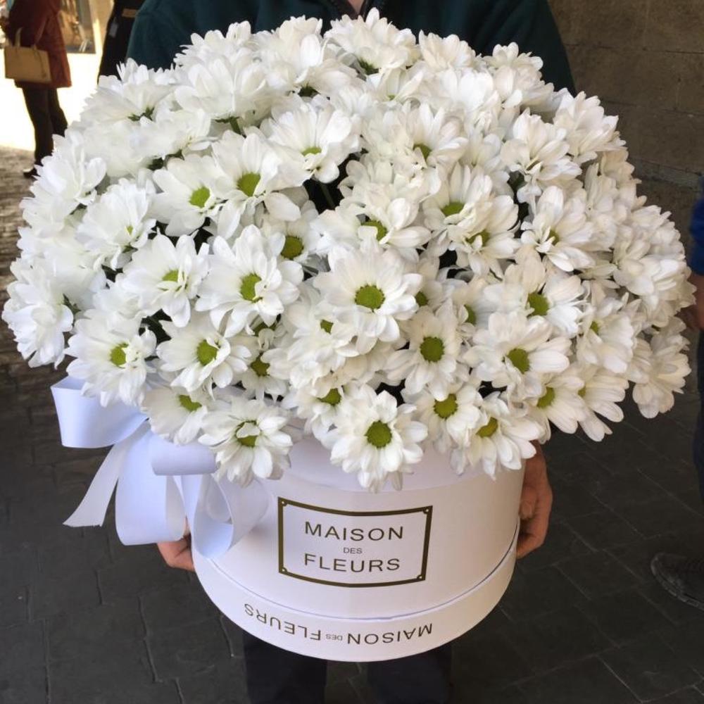 Ромашковые хризантемы являются отличной альтернативой летним ромашкам. Всем любителям ромашек, предлагаем шикарную композицию из белых хризантем в большой фирменной белой Коробке. Данную композицию можно подарить на любой повод!
