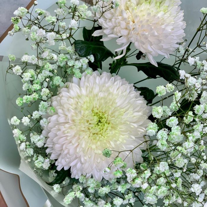 Воздушный букет из хризантем и гипсофилы
