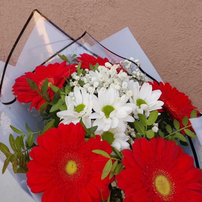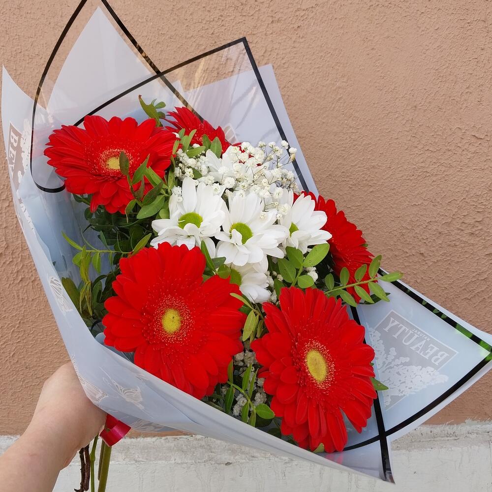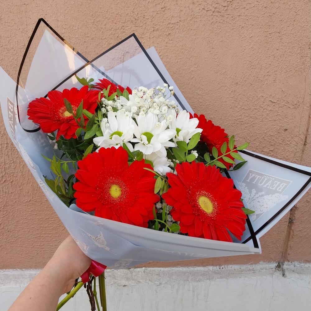 Гипсофила – 1 шт.Гербера – 5 шт.Фисташка – 10 шт.Упаковка дизайнерская – 3 шт.бакарди ромашка хризантема кустовая – 1 шт.