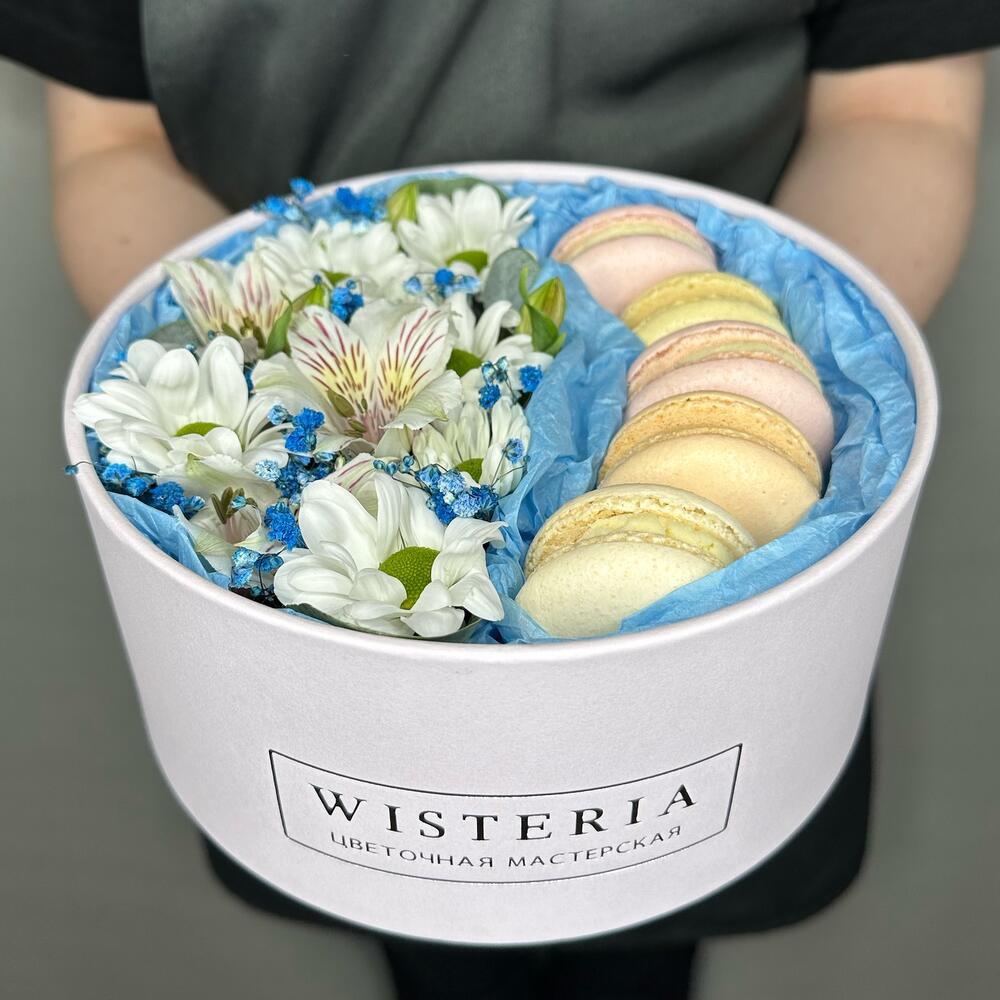 Альстромерия – 1 шт.Эвкалипт – 1 шт.Тишью – 1 шт.Хризантема кустовая ромашковая – 1 шт.Губка флористическая – 1 шт.гипсофила цветная – 1 шт.макарон ассорти – 5 шт.