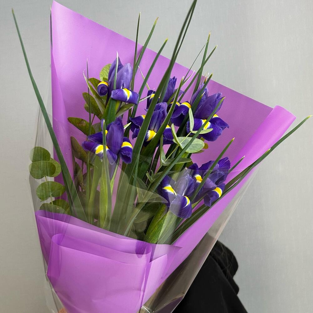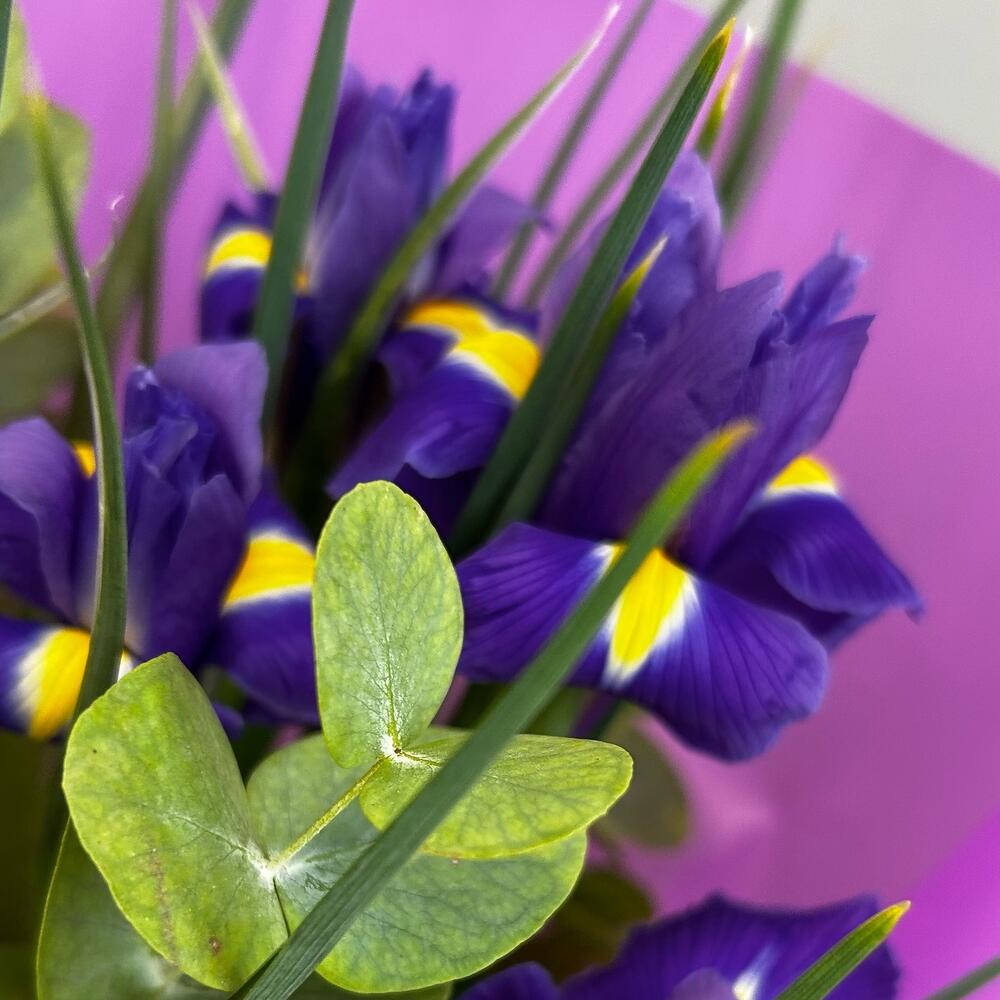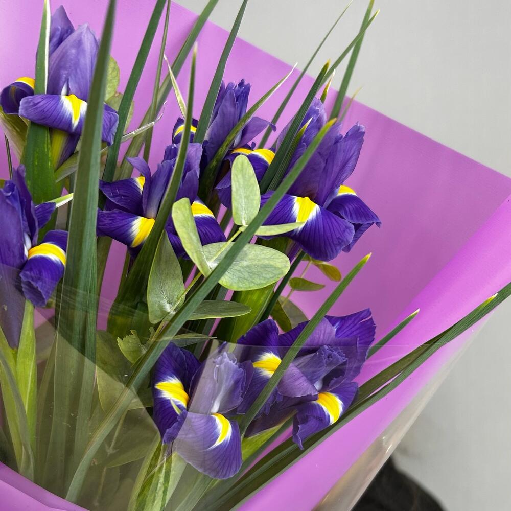 Букет из ярких фиолетовых ирисов и ароматного эвкалипта