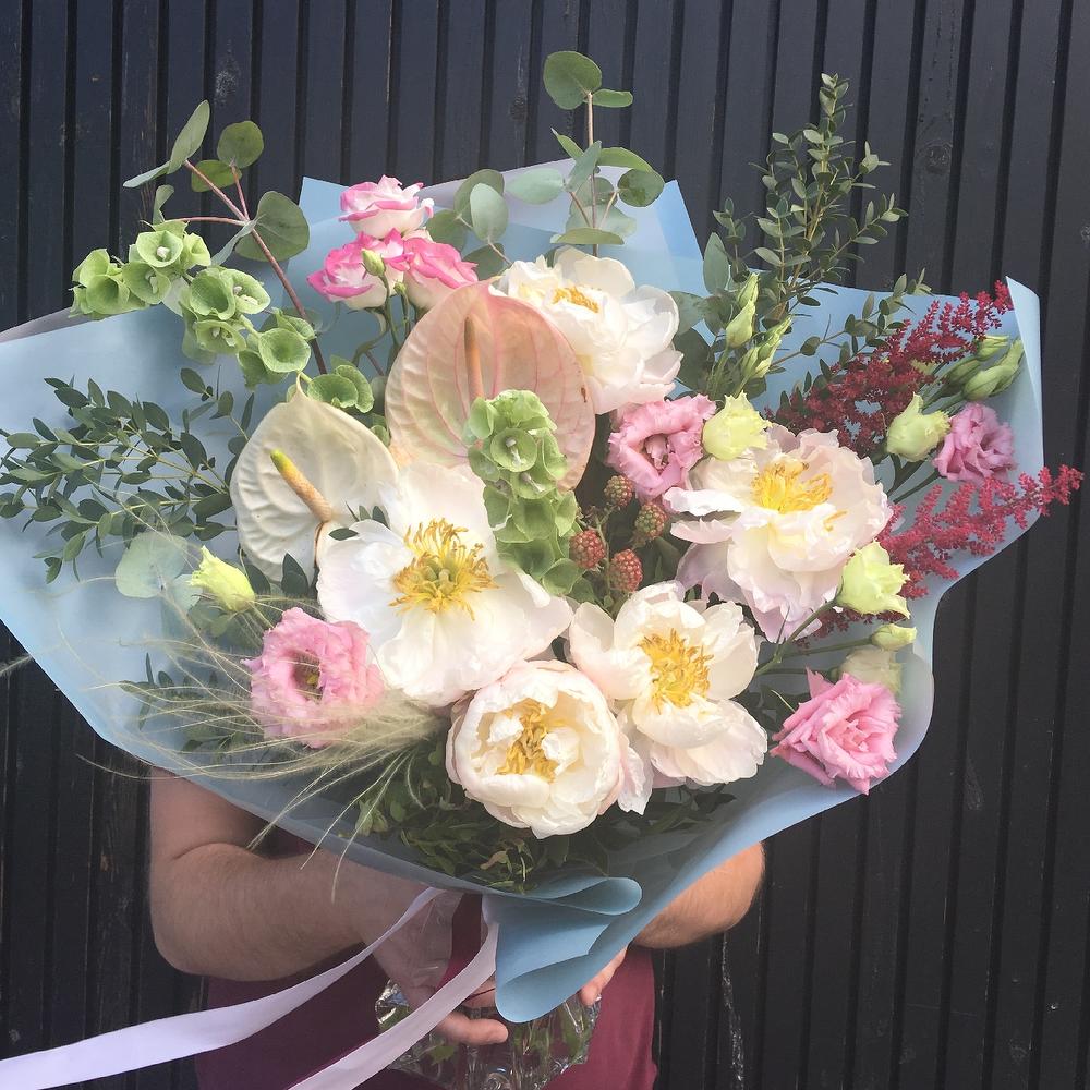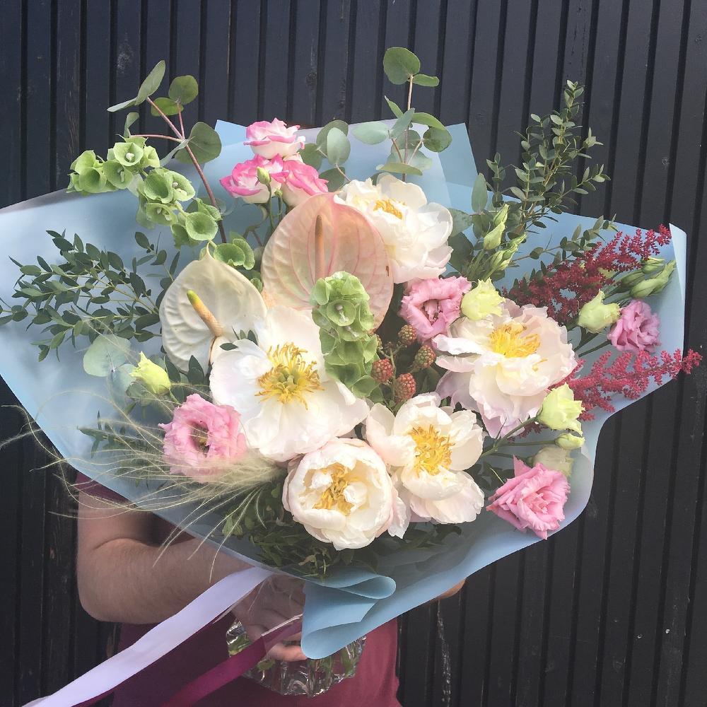 Антуриум – 2 шт.Пион – 5 шт.Лизиантус – 5 шт.Астильба – 2 шт.Молюцелла – 2 шт.Ковыль – 1 шт.Ежевика – 1 шт.Эвкалипт – 7 шт.Упаковка – 2 шт.Лента атласная – 2 шт.