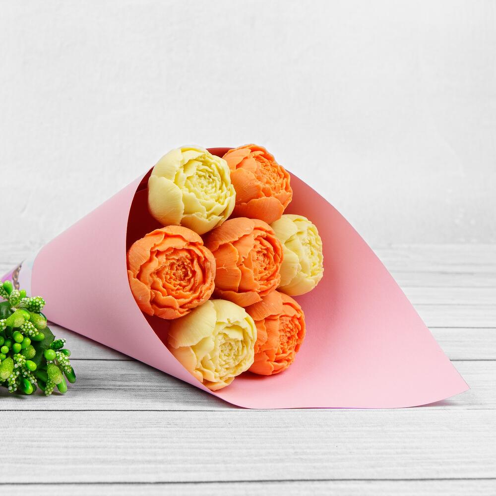 Упаковка Кулек – 1 шт.Прозрачная пленка – 1 шт.шоколадные пионы из бельгийского шоколада – 7 шт.