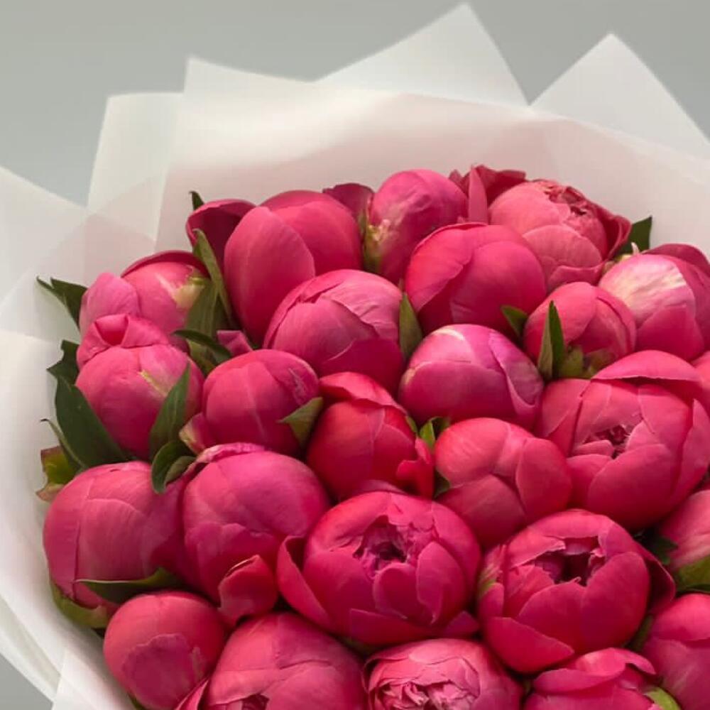Пион – 25 шт.Упаковка дизайнерская – 1 шт.Лента атласная – 2 шт.Открыточка с вашими пожеланиями – 1 шт.хорошее настроение – 100 шт.инструкция по уходу за цветами – 1 шт.коробка переноска – 1 шт.Кризал – 1 шт.