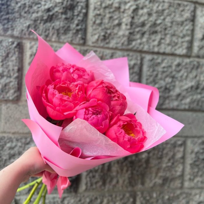 Пион – 5 шт.Лента атласная – 1 шт.Упаковка дизайнерская – 3 шт.