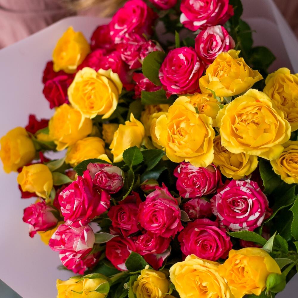 кустовая роза микс – 9 шт.Корейская упаковка – 1 шт.Атласная лента – 1 шт.