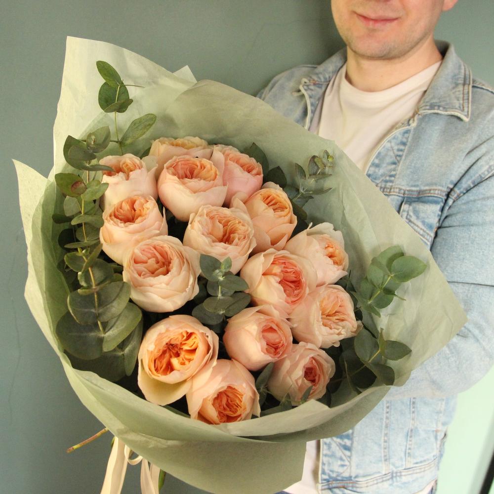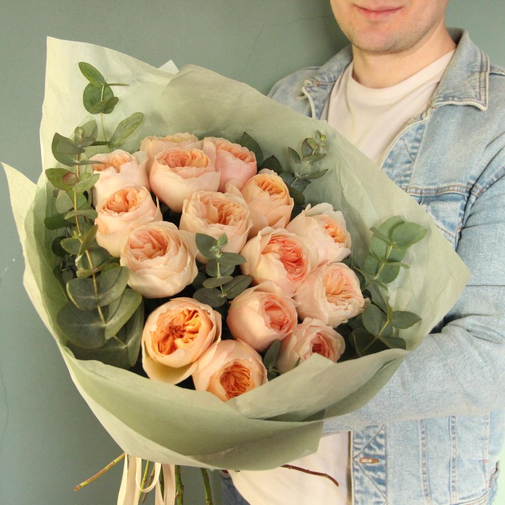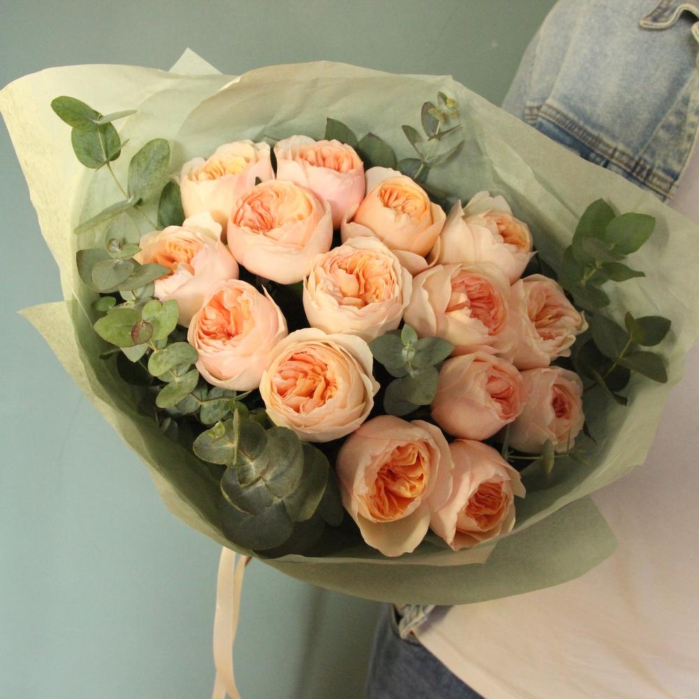 Роза пионовидная – 15 шт.Эвкалипт – 5 шт.Тишью – 4 шт.Лента атласная – 2 шт.