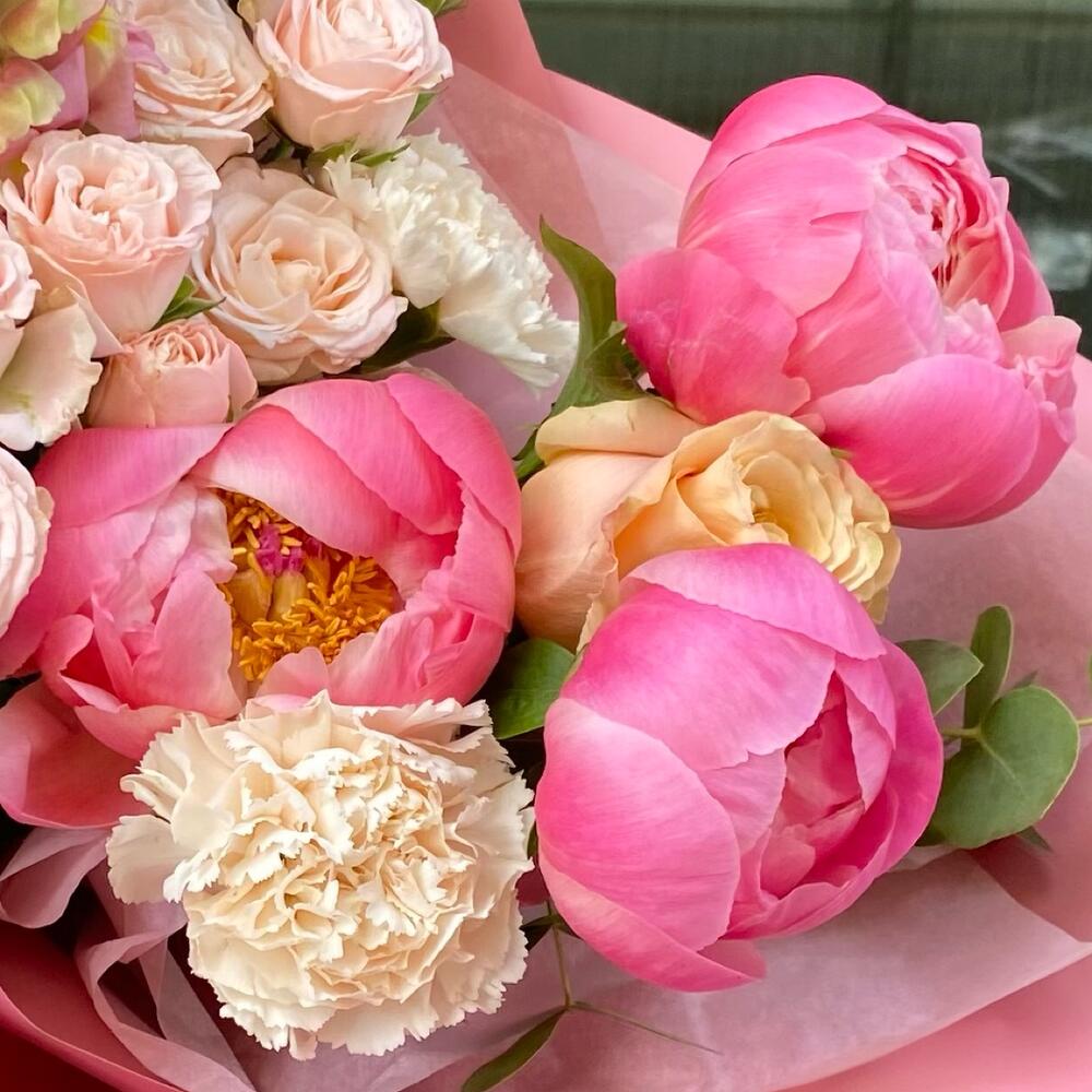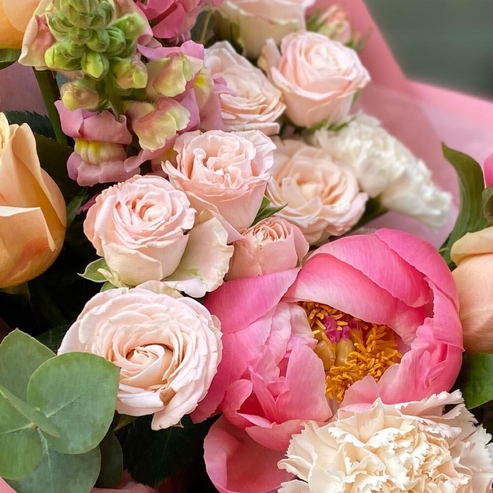 Пион Коралл Шарм (Coral Charm) – 3 шт.Роза шиммер – 3 шт.Диантус сортовой – 3 шт.антиринум – 2 шт.Эвкалипт Микс – 2 шт.Упаковка дизайнерская – 3 шт.Лента атласная – 1 шт.Роза кустовая пионовидная бомбастик – 2 шт.