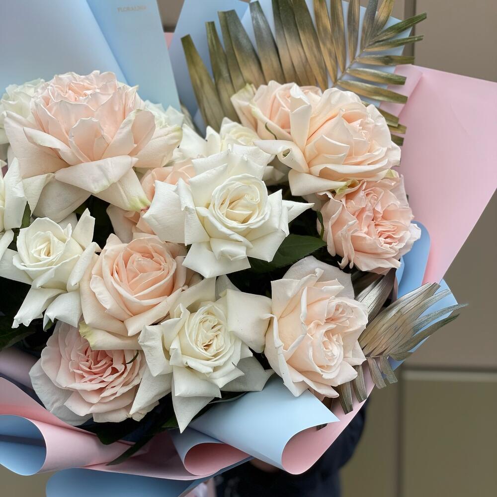 Роза Эквадор – 7 шт.Лента атласная – 2 шт.Фисташка – 3 шт.Роза пионовидная – 8 шт.Упаковка дизайнерская – 6 шт.чико крашенная – 2 шт.