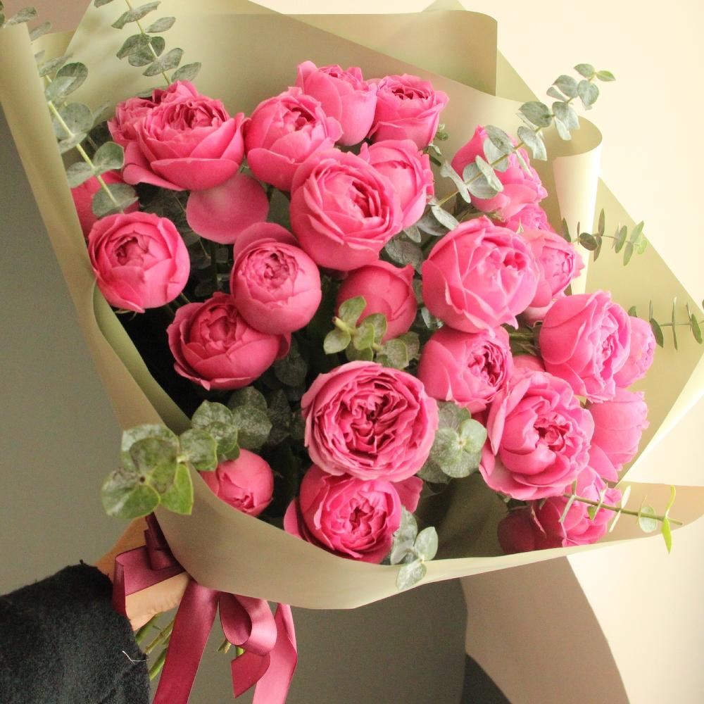 Роза кустовая пионовидная – 9 шт.Эвкалипт – 5 шт.Упаковка – 3 шт.Лента атласная – 2 шт.