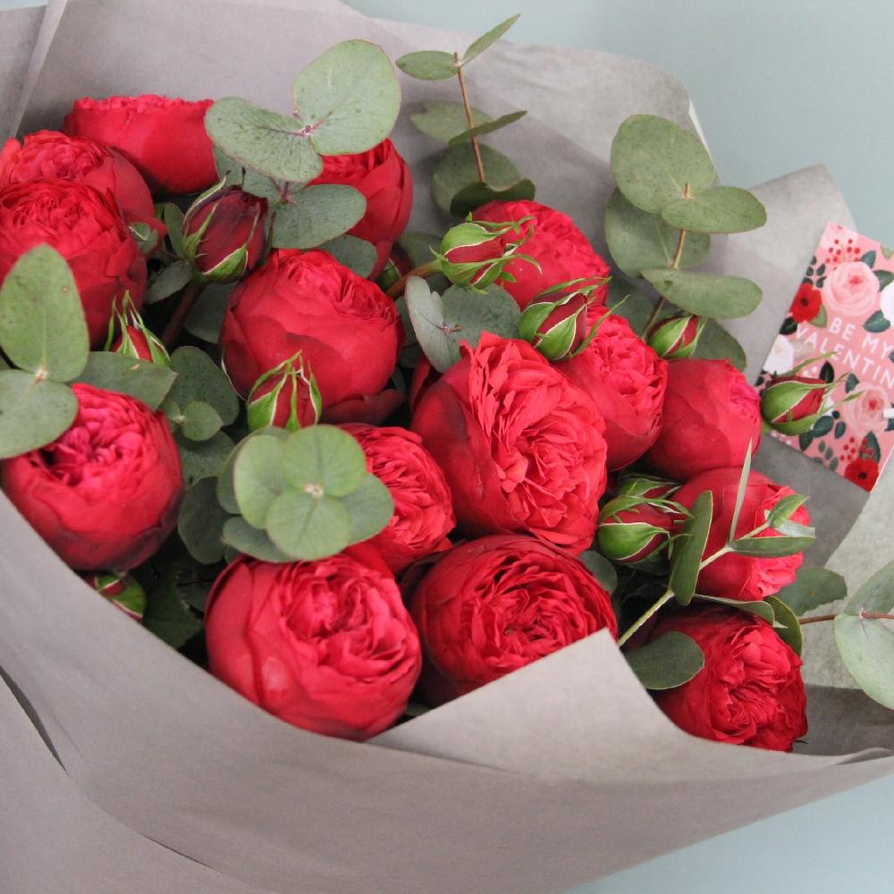 Роза пионовидная – 15 шт.Эвкалипт – 7 шт.Упаковка дизайнерская – 3 шт.Лента атласная – 2 шт.Открытка – 1 шт.