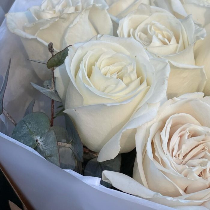 Эвкалипт – 1 шт.Роза одноголовая – 13 шт.Лента атласная – 1 шт.Тишью – 1 шт.Упаковка дизайнерская – 1 шт.