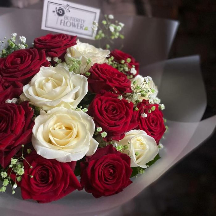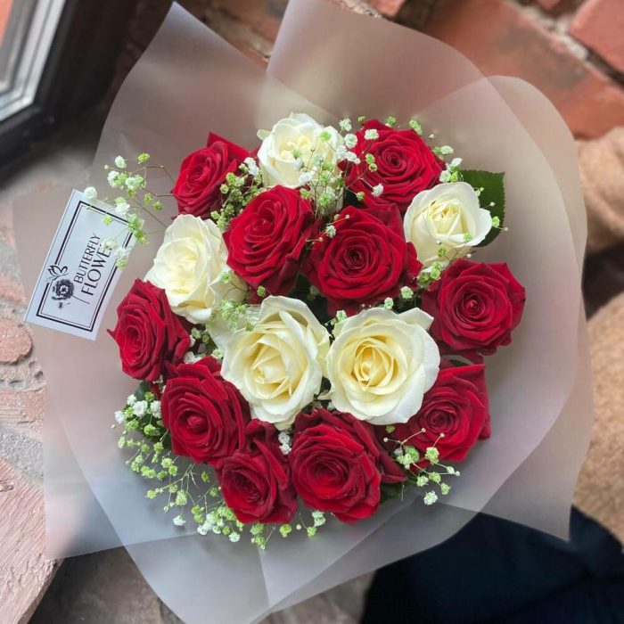 Букет из красных и белых роз с гипсофилой в стильной упаковке “Фолсен”