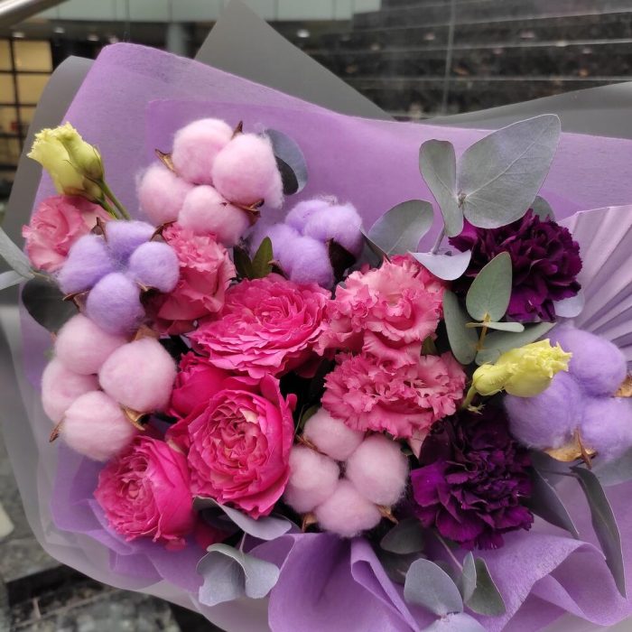 Роза кустовая пионовидная – 1 шт.Лизиантус – 1 шт.Диантус – 2 шт.Хлопок – 6 шт.Пальма – 1 шт.Эвкалипт – 1 шт.Лента – 2 шт.Упаковка дизайнерская – 2 шт.