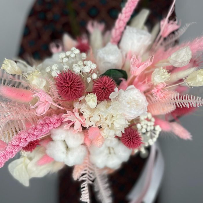 Эрингиум – 3 шт.роза пионовидная стабилизированная – 3 шт.Ковыль – 1 шт.Лагурус – 53 шт.Кашпо керамическое – 1 шт.Нигелла сухоцвет – 5 шт.Оазис флористический – 1 шт.Хлопок натуральный – 3 шт.Вейник – 2 шт.Эвкалипт стабилизированный – 3 шт.гортензия сухоцвет – 1 шт.фаларис сухоцвет – 23 шт.лист пальмы сухоцвет – 1 шт.камыш сухоцвет – 1 шт.сетария сухоцвет – 2 шт.пижма сухоцвет – 3 шт.Лента – 2 шт.