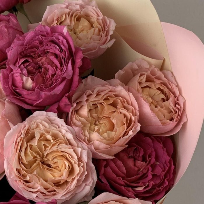 джульетта кустовая роза пионовидная – 7 шт.Пленка дизайнерская – 1 шт.Лента атласная – 1 шт.