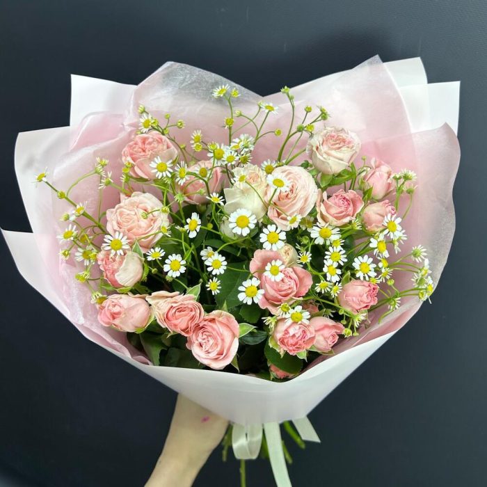 Матрикария – 4 шт.Кустовая роза розовая – 5 шт.Упаковка дизайнерская – 1 шт.
