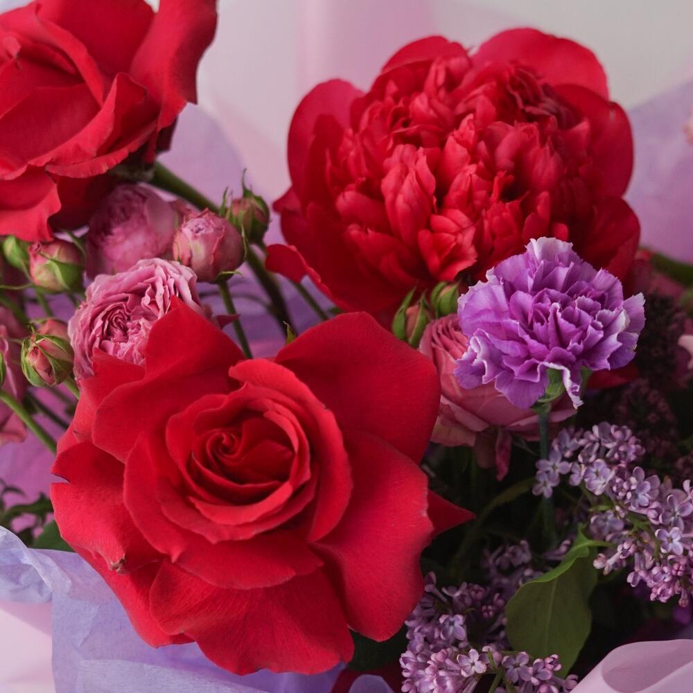 Пион – 1 шт.Роза французская – 2 шт.Роза кустовая – 2 шт.пампасная трава – 2 шт.Диантус – 4 шт.лизаантус – 2 шт.Сирень – 1 шт.Упаковка дизайнерская – 1 шт.