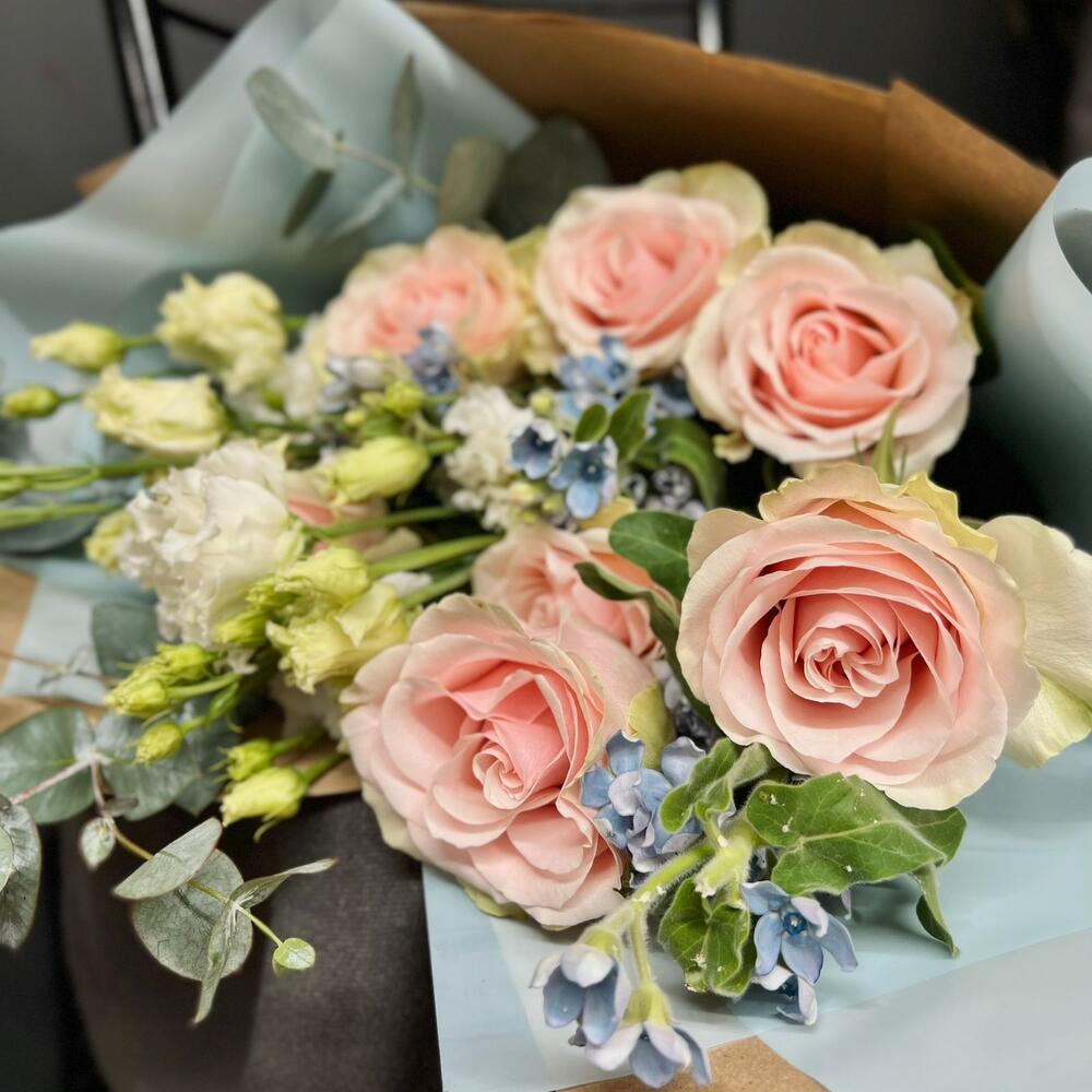 Роза одноголовая – 7 шт.Оксипеталум – 3 шт.Лизиантус – 1 шт.Упаковка дизайнерская – 1 шт.зелень декоративная – 2 шт.