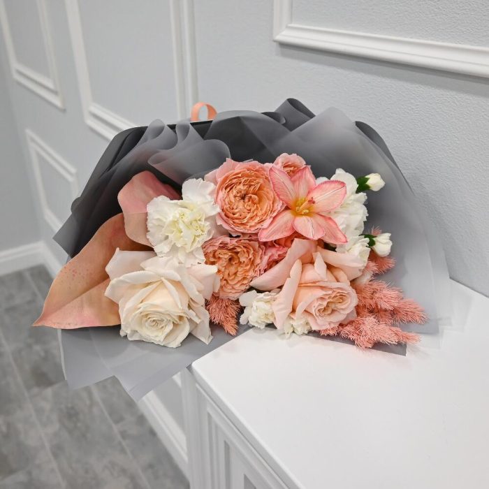 кустовая роза джульетта – 1 шт.Тюльпан – 1 шт.Диантус сортовой – 2 шт.Диантус кустовой – 2 шт.Роза shimmer – 1 шт.роза playa blanka – 1 шт.Лист магнолии – 2 шт.Аспарагус – 1 шт.Фисташка – 3 шт.Упаковка дизайнерская – 2 шт.Лента атласная – 1 шт.