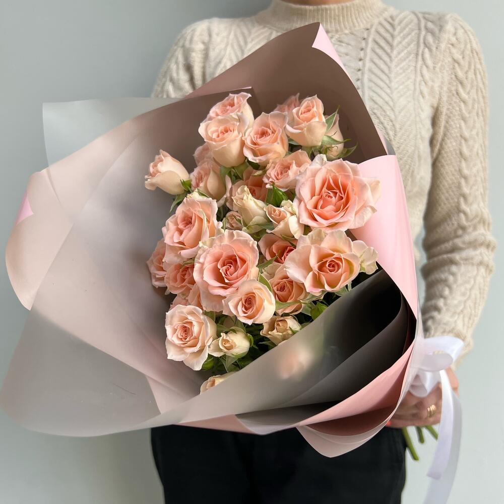 Кустовая роза – 5 шт.Лента атласная – 1 шт.Упаковка дизайнерская – 3 шт.