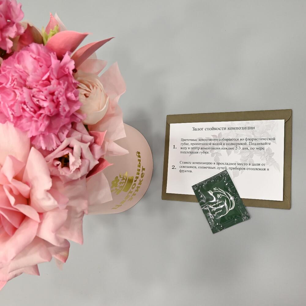 Маттиола – 1 шт.Рускус – 3 шт.Гвоздика – 2 шт.Эустома – 1 шт.Шляпная коробка – 1 шт.Французская роза – 1 шт.Пионовидная кустовая роза – 1 шт.Оазис флористический – 1 шт.