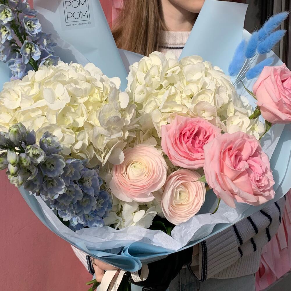 Гортензия – 3 шт.Дельфиниум – 2 шт.Лагурус – 1 шт.Ранункулюс – 2 шт.Роза – 3 шт.Упаковка дизайнерская – 1 шт.