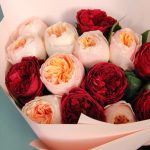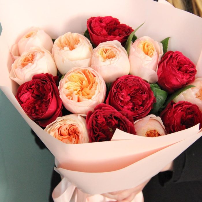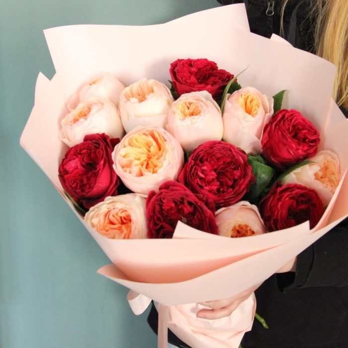 Упаковка дизайнерская – 4 шт.Лента атласная – 1 шт.Роза пионовидная англия – 15 шт.