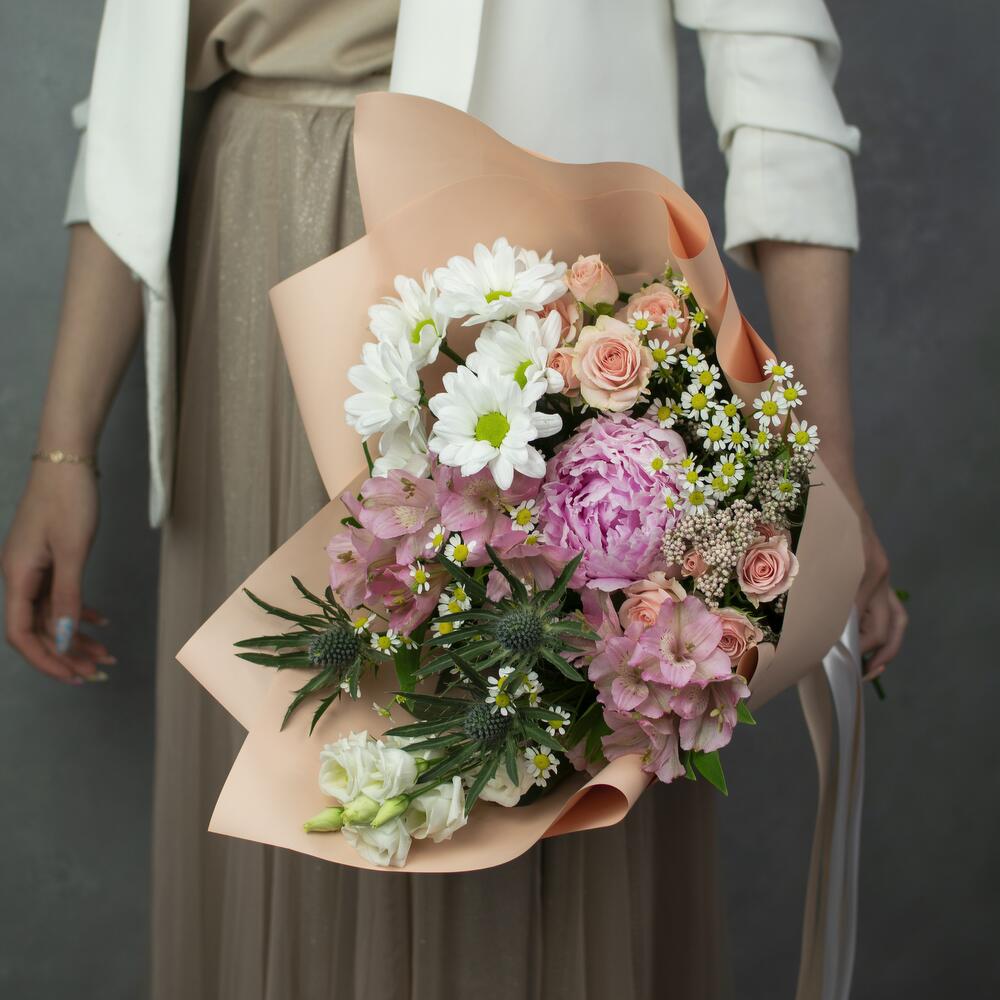 Альстромерия – 2 шт.Лизиантус – 1 шт.Озотамнус – 1 шт.Хризантема кустовая – 1 шт.Эрингиум – 1 шт.Кустовая роза – 2 шт.Матрикария – 1 шт.Пион Сара Бернар – 1 шт.